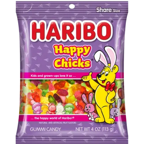Glade påskekyllinger! Haribo Happy Chicks er de frugtige gummislik formet som kyllinger. Søde, tygbare og farverige kyllinger - perfekt påskeslik til hele familien. Perfekt til påske eller til dig, der elsker Haribo! 🐣🌈