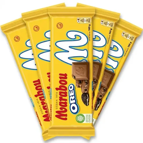 Marabou Oreo kombinerer Marabous klassiske mælkechokolade med sprøde kakaokiks og vaniljefyld, der matcher perfekt. Den cremede chokolade omslutter bidder af Oreo-kiks for en dejlig teksturkontrast. En perfekt fusion af to elskede klassikere.