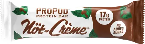 ProPud Protein Nødde-Crème er proteinbaren, der smager som det chokoladepålæg, du elsker! Blød bar med cremet hasselnødsmag dækket i chokolade - 17g protein uden tilsat sukker. Det er som at spise Nutella bare i barformat med proteinboost. Perfekt efter træning, som mellemmåltid eller når du længes efter nøddechokolade, men vil holde dig på rette spor!
