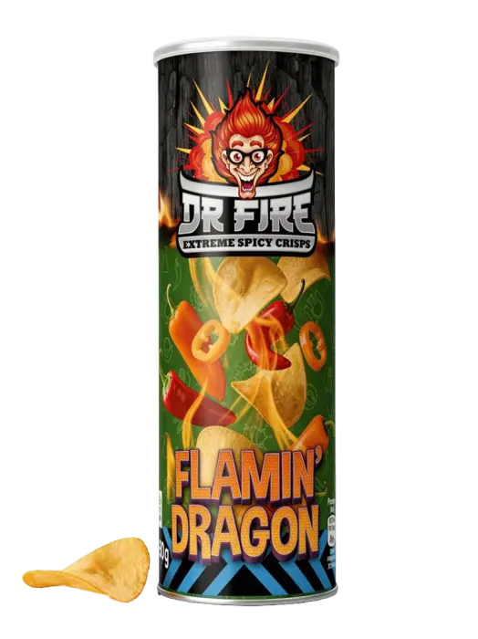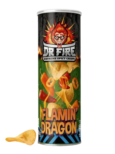 Dragens åndedræt i chipsform! Dr Fire Extreme Spicy Crisps Flamin' Dragon er chips til den modige - ekstremt hede og krydrede med dragens egen varme. Sprøde chips, der brænder fra første bid og ikke slipper taget. Perfekt til dig, der elsker varm-udfordringer eller vil imponere vennerne med din tolerance. Advarsel: dette er ingen leg! 🐉🔥