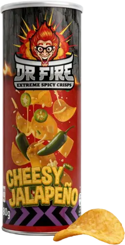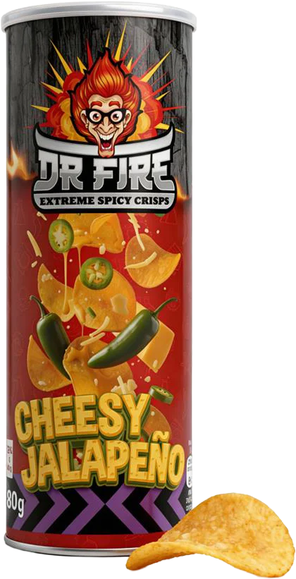 Ostete og ildrøde! Dr Fire Extreme Spicy Crisps Cheesy Jalapeño er chips, der kombinerer cremet ost med hed jalapeño-kick. Perfekt balance mellem cheesy-godhed og chilivarme, der gør dem afhængighedsskabende. Til dig, der elsker både ost og stærk mad, eller vil have noget lidt mere sofistikeret end almindelige ostechips. Osten møder varmen! 🧀🌶️