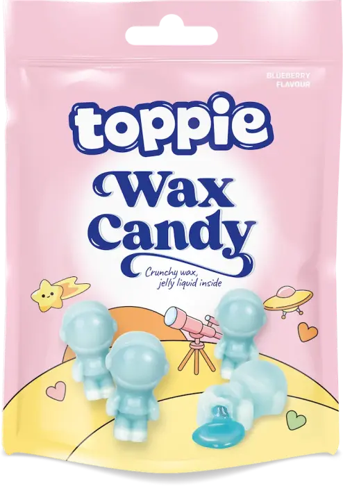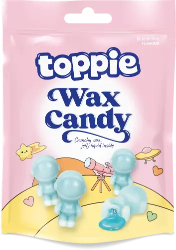 Astronauter med hemmelig fyld! Toppie Wax Candy Blueberry er de søde astronauter med sprød voksskal og gelé-agtig blåbærvæske indeni. Først bider du, så eksploderer smagen! Perfekt til børn, der elsker både rummet og slik, eller voksne, der husker Wax Bottles fra før. Lille astronaut, stor smagsoplevelse! 🚀💙