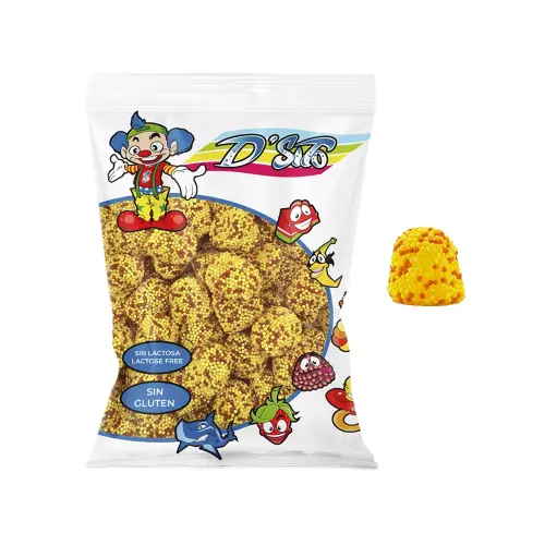 socker, glukossirap, geleringsmedel (gelatin, pektin), stärkelse (majs), stärkelse (ris), syra (E330), aromer, färgämnen (E102, E110, E129), ytbehandlingsmedel (bivax, karnaubavax). Innehåller AZO-färgämnen som kan ha negativ effekt på barns beteende och koncentration. Näringsinformation: Per 100 g. Energi: 1622 kJ / 382 kcal / Fett: <0,5 g / Varav mättat fett: 0,07 g / Kolhydrater: 94,7 g / Varav sockerarter: 54,3 g / Protein: <2,5 g / Salt: 0,26 g.
