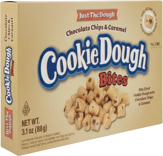 Just The Dough Cookie Dough Bites i smagen chokoladechips og karamel – seje, tilpas søde kagedejsbidder der smager præcis som at stjæle dej fra skålen inden kagerne går i ovnen. Men i praktisk snacksstørrelse. Det rå bedste ved bagning, uden bagningen. 🍪🍫